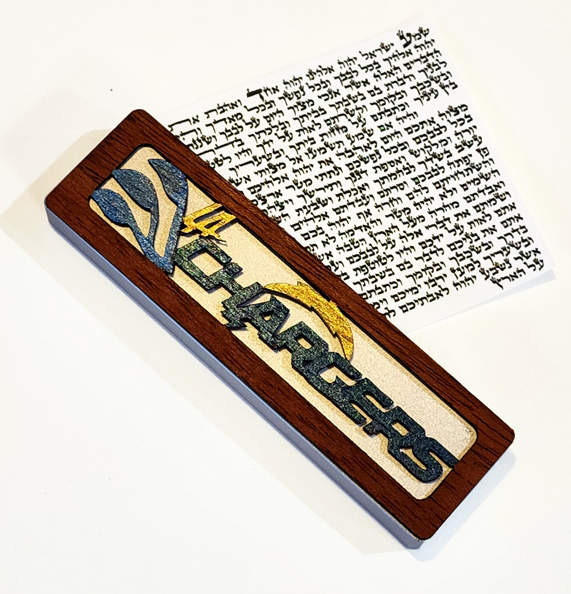 Gift boxed and ready for giving, this “Los Angeles Chargers” Mezuzah available with non-kosher scroll or with a kosher scroll*, is precision cut from mahogany wood, hand-painted, and based on a high-quality anodized aluminum case with self-adhesive backing.