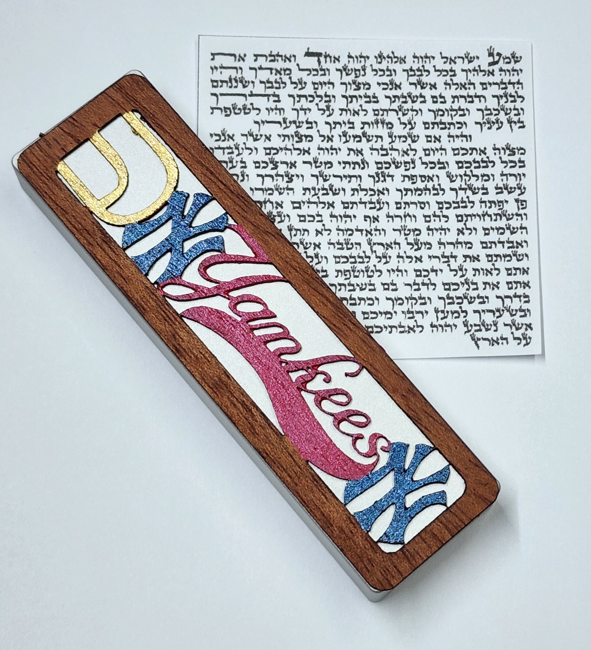 Gift boxed and ready for giving, this “New York Yankees” Mezuzah available with non-kosher scroll or with a kosher scroll*, is precision cut from mahogany wood, hand-painted, and based on a high-quality anodized aluminum case with self-adhesive backing.