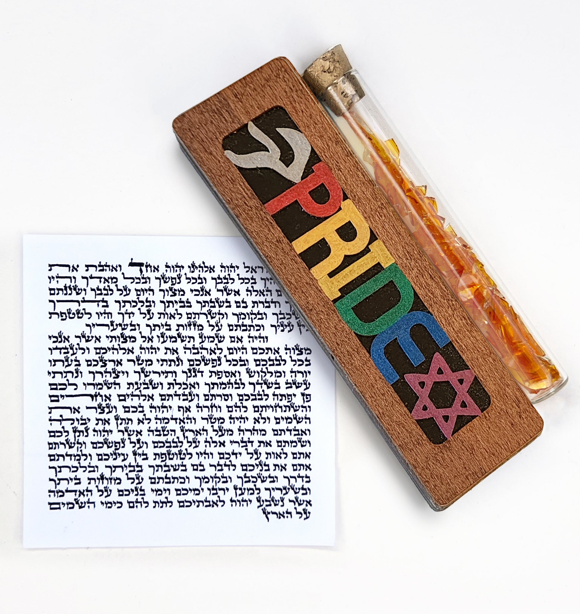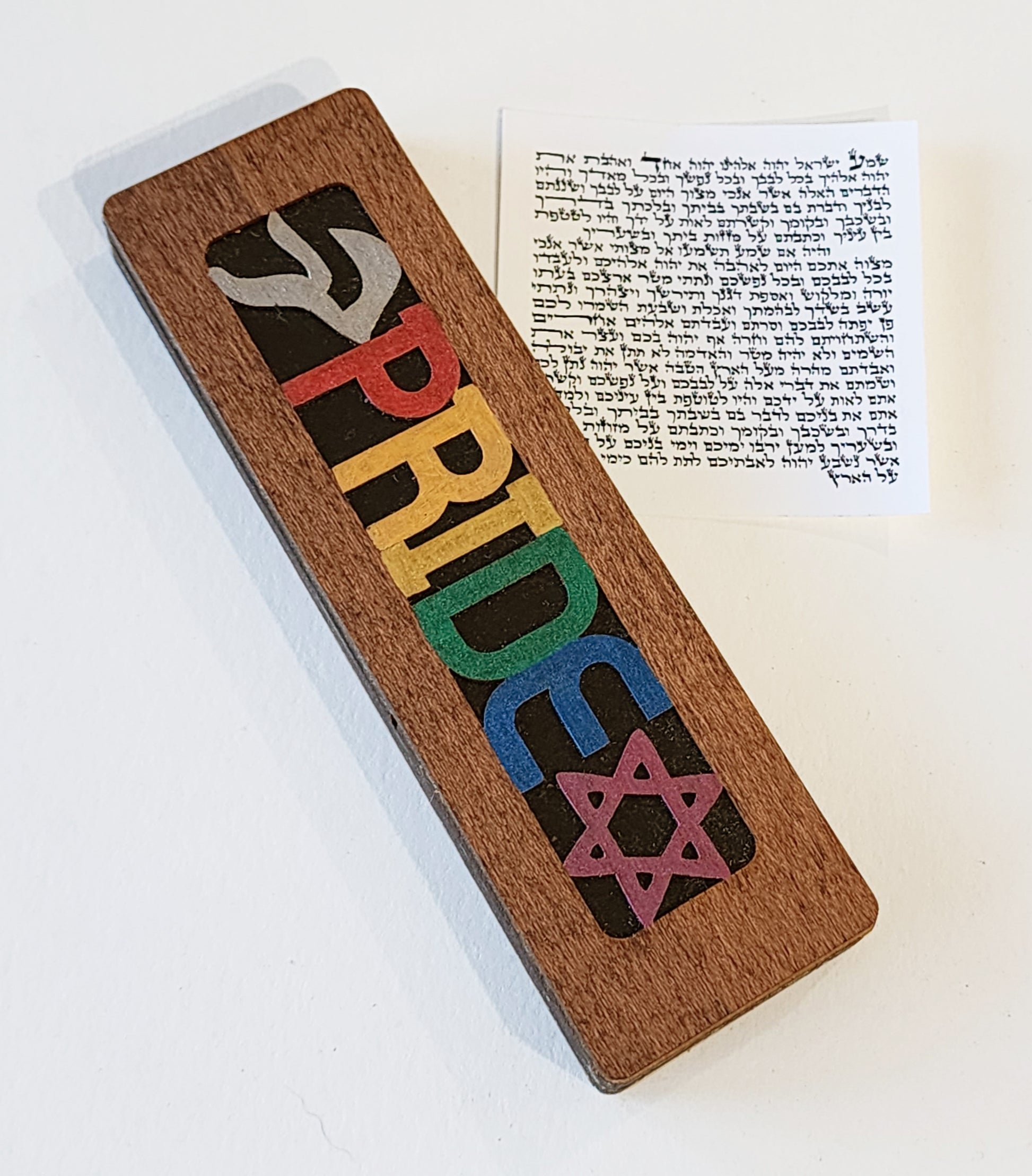 Gift boxed and ready for giving, this “Pride” Mezuzah available with non-kosher scroll or with a kosher scroll*, is precision cut from mahogany wood, hand-painted, and based on a high-quality anodized aluminum case with self-adhesive backing. Also available with a glass tube firmly attached to the side for a newly wedded couple to fill with shards from their wedding glass.