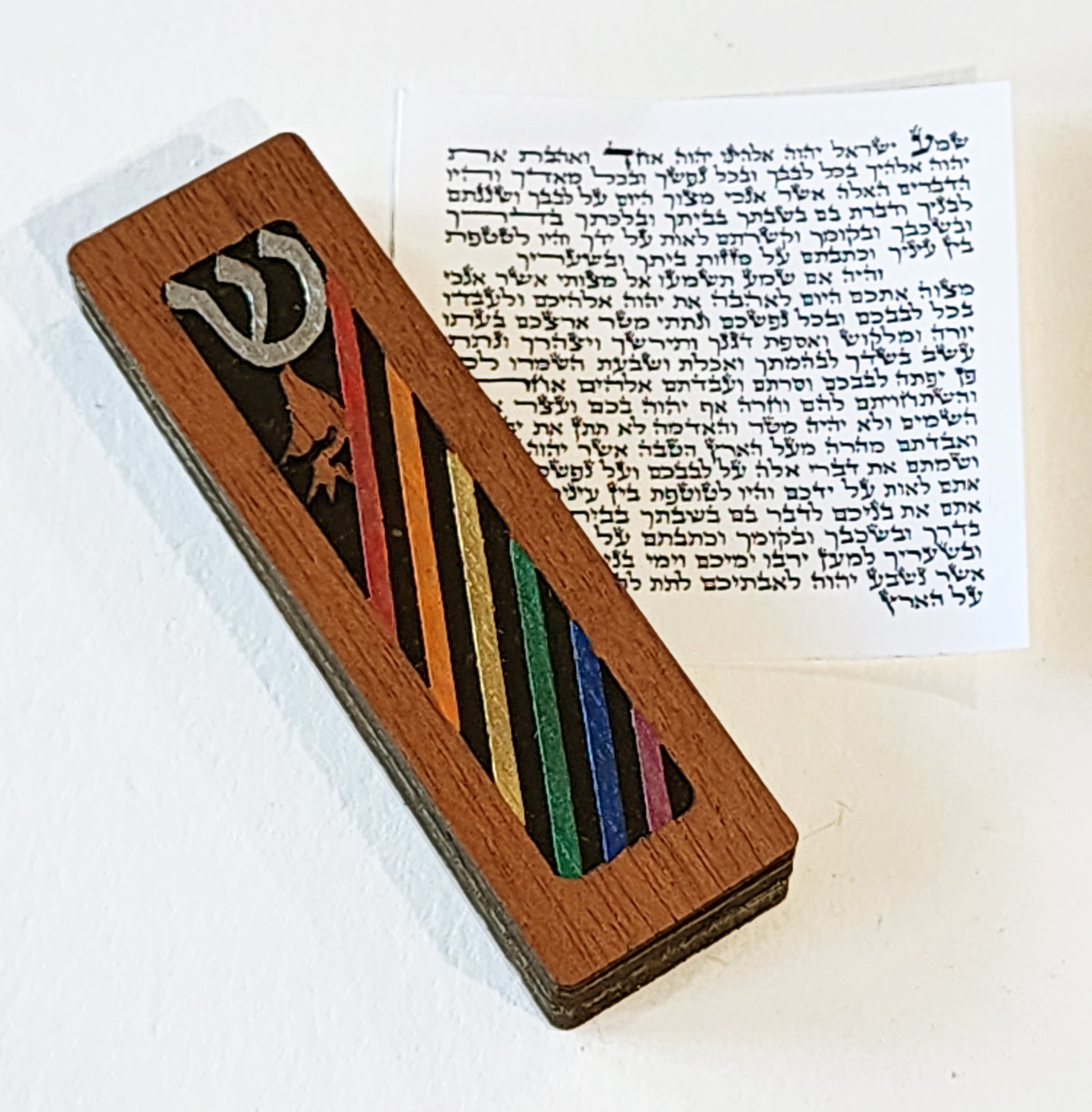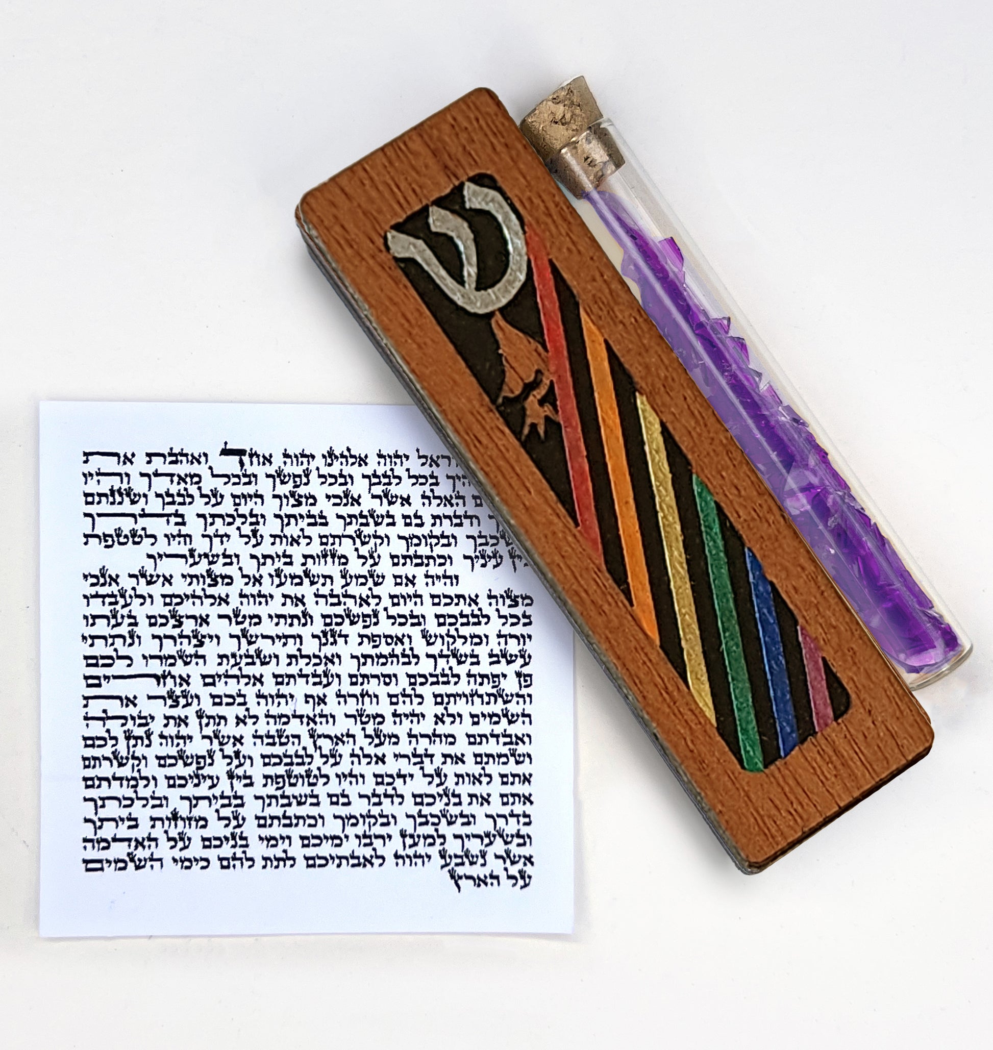 Gift boxed and ready for giving, this “Rainbow Pride” Mezuzah available with non-kosher scroll or with a kosher scroll*, is precision cut from mahogany wood, hand-painted, and based on a high-quality anodized aluminum case with self-adhesive backing. Also available with a glass tube firmly attached to the side for a newly wedded couple to fill with shards from their wedding glass.