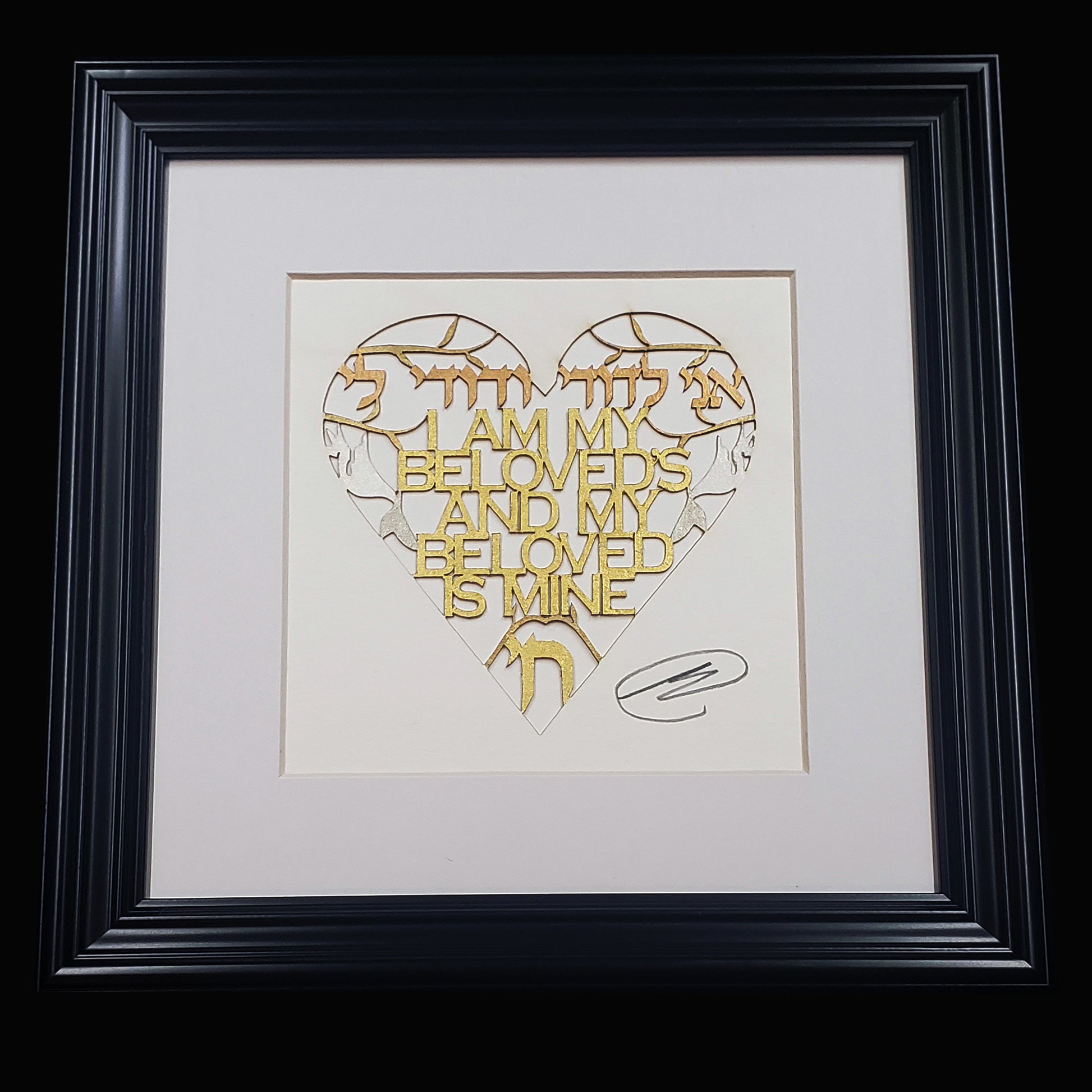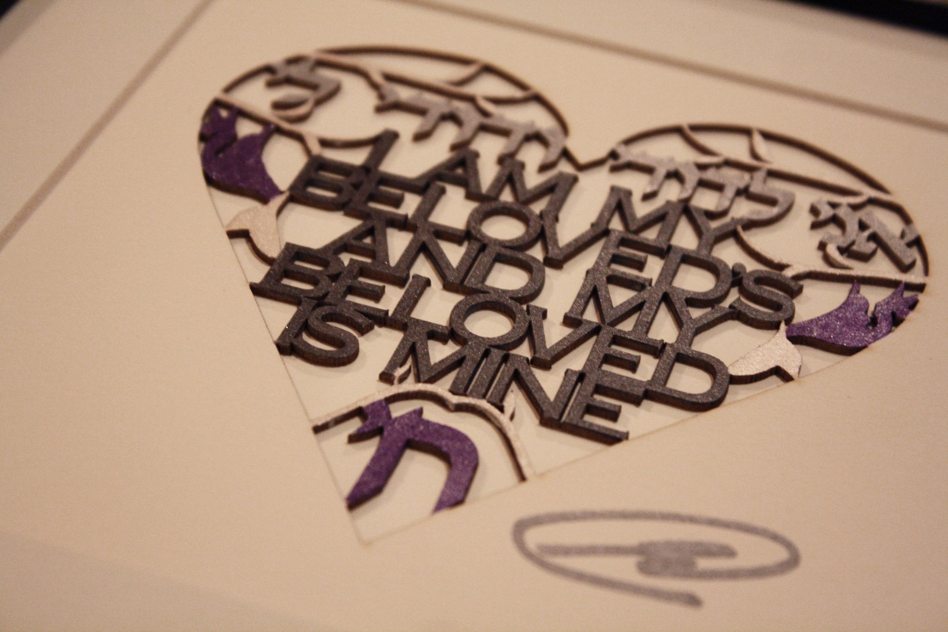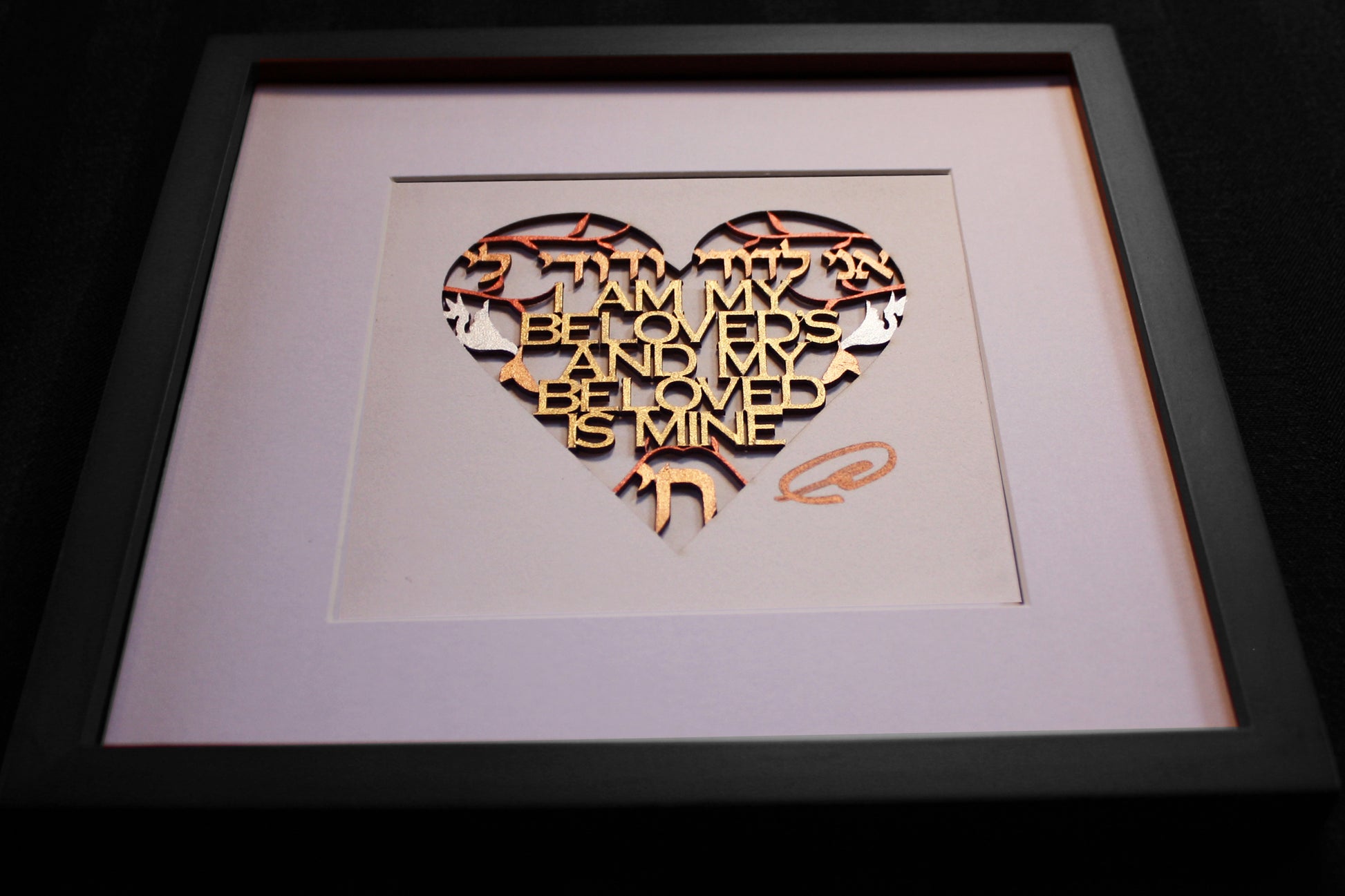 Translates to "I am my beloved's, and my beloved is mine". This is one of the most well-known quotes from the "The Song of Songs", written by King Solomon. It is in the form of a beautiful, romantic declaration between two loving people. The intertwining beauty of love is captured in this beautiful piece integrating the Hebrew phrase with its English translation, all housed within a petite heart.