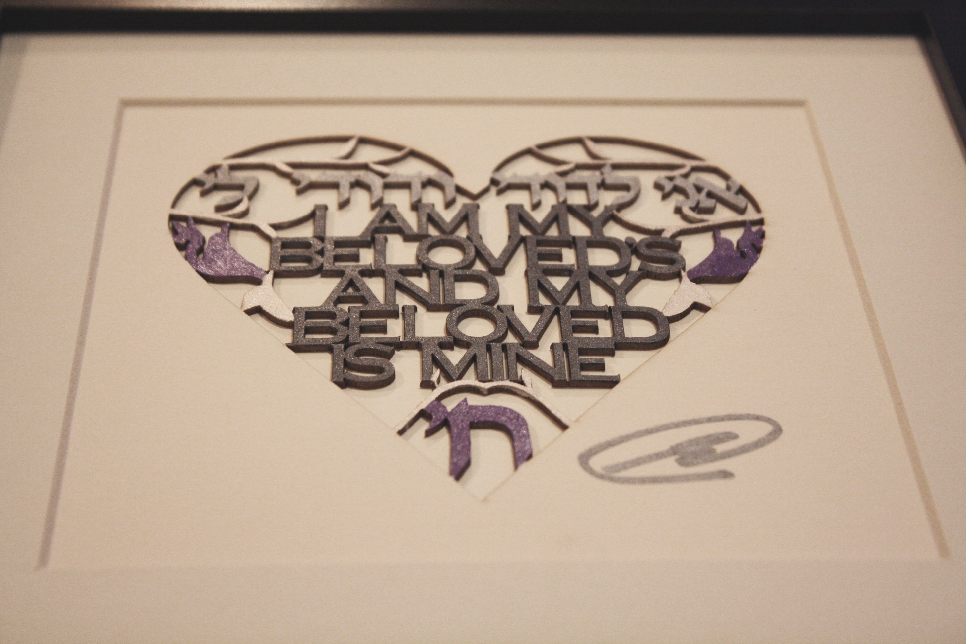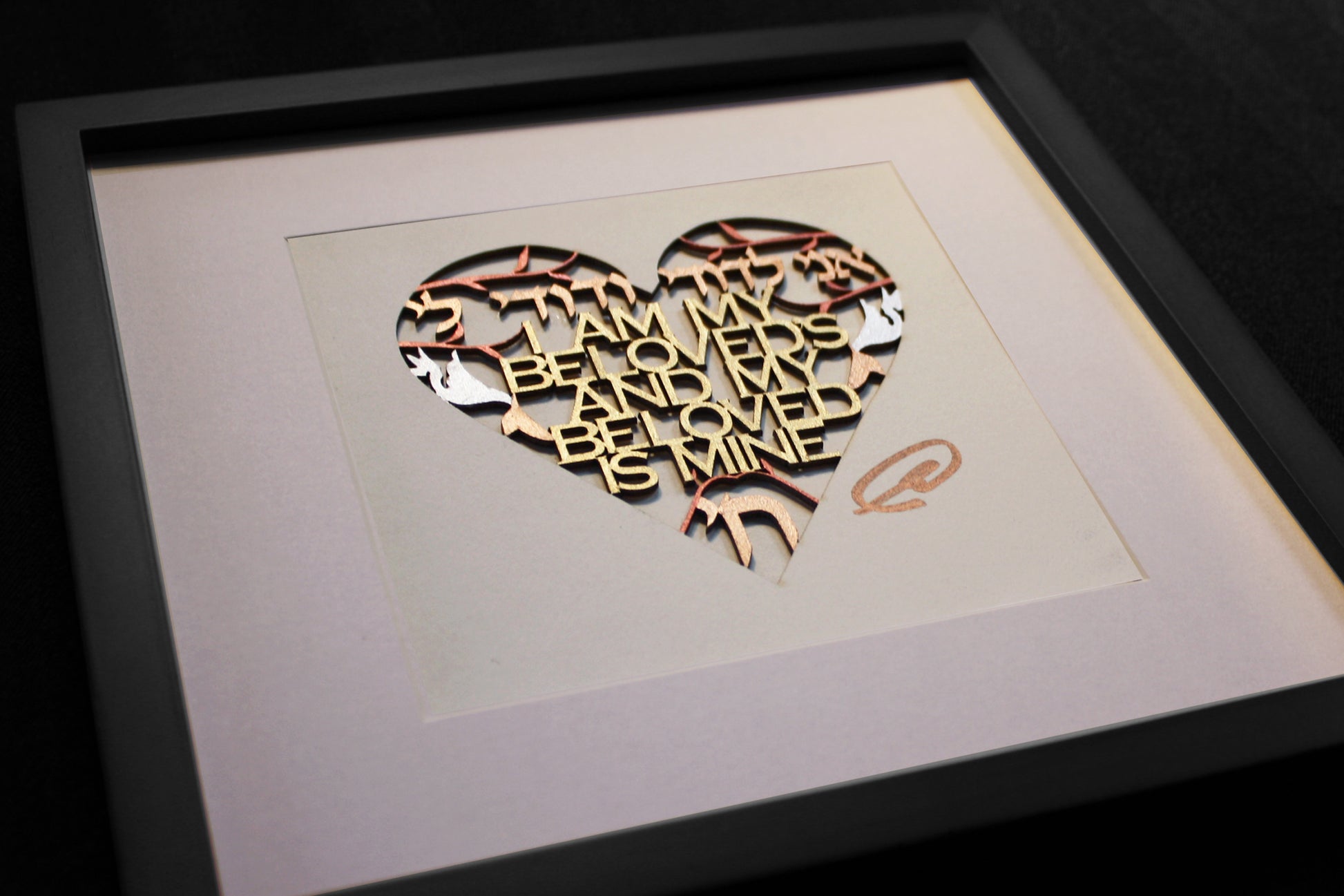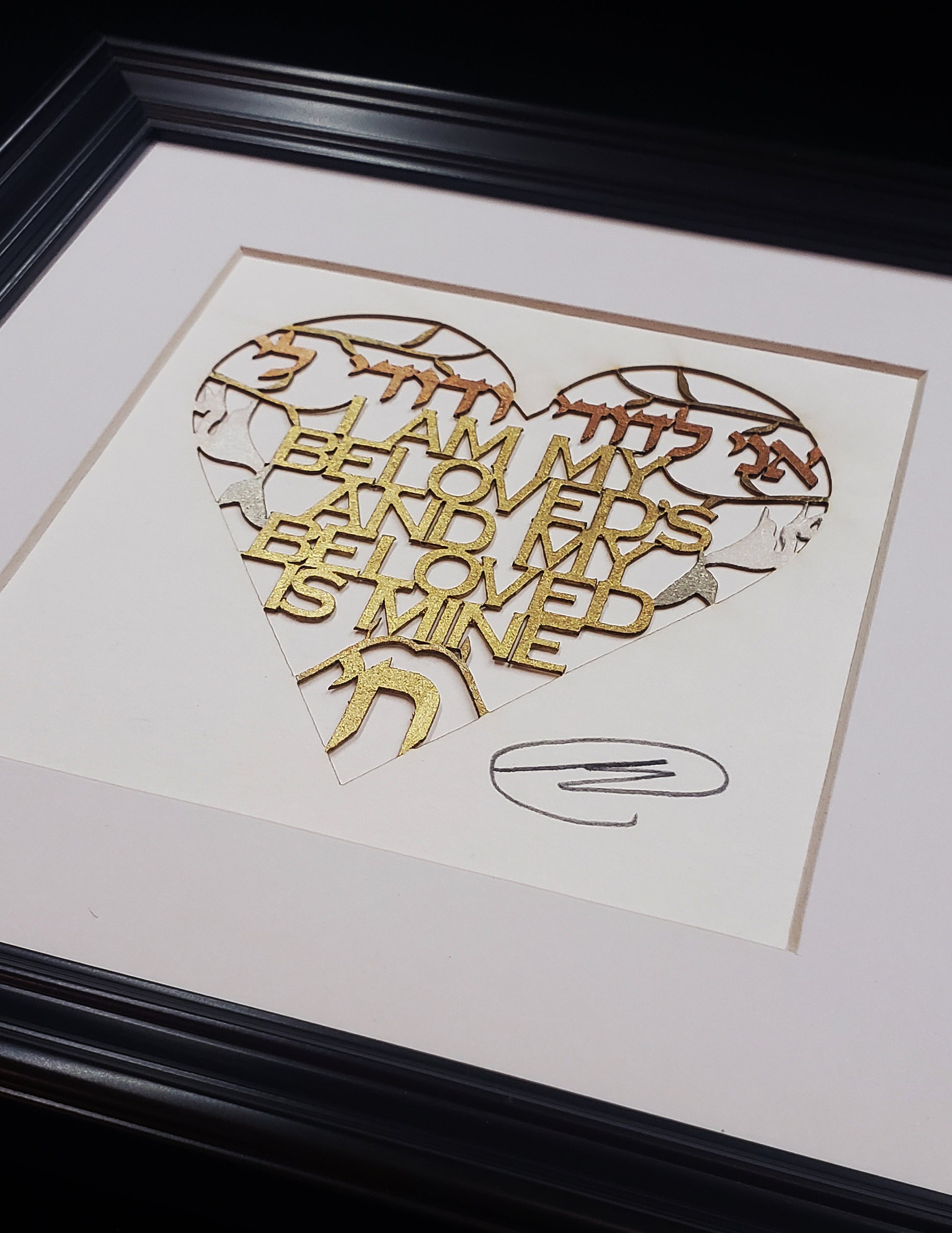 Translates to "I am my beloved's, and my beloved is mine". This is one of the most well-known quotes from the "The Song of Songs", written by King Solomon. It is in the form of a beautiful, romantic declaration between two loving people. The intertwining beauty of love is captured in this beautiful piece integrating the Hebrew phrase with its English translation, all housed within a petite heart.