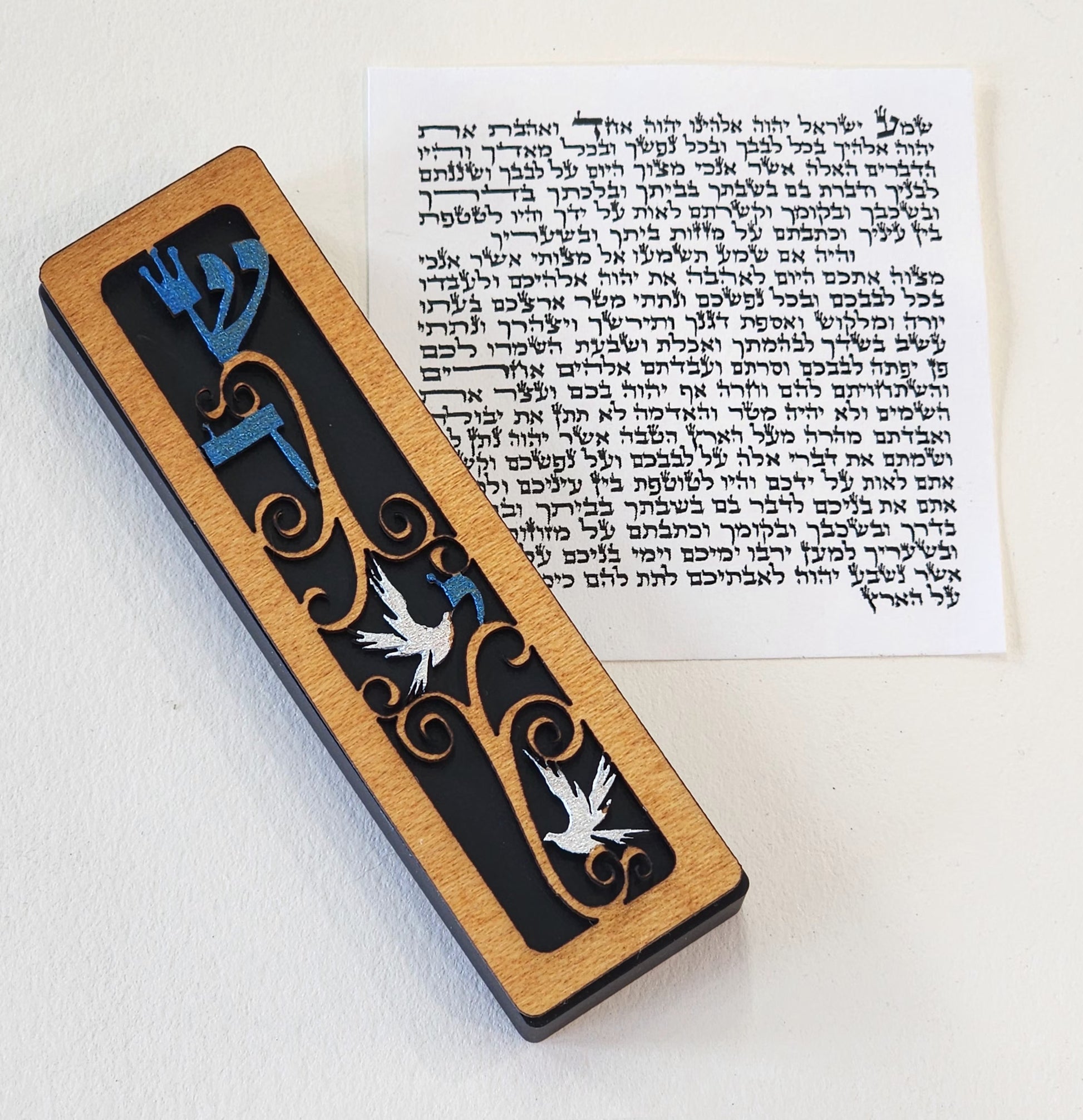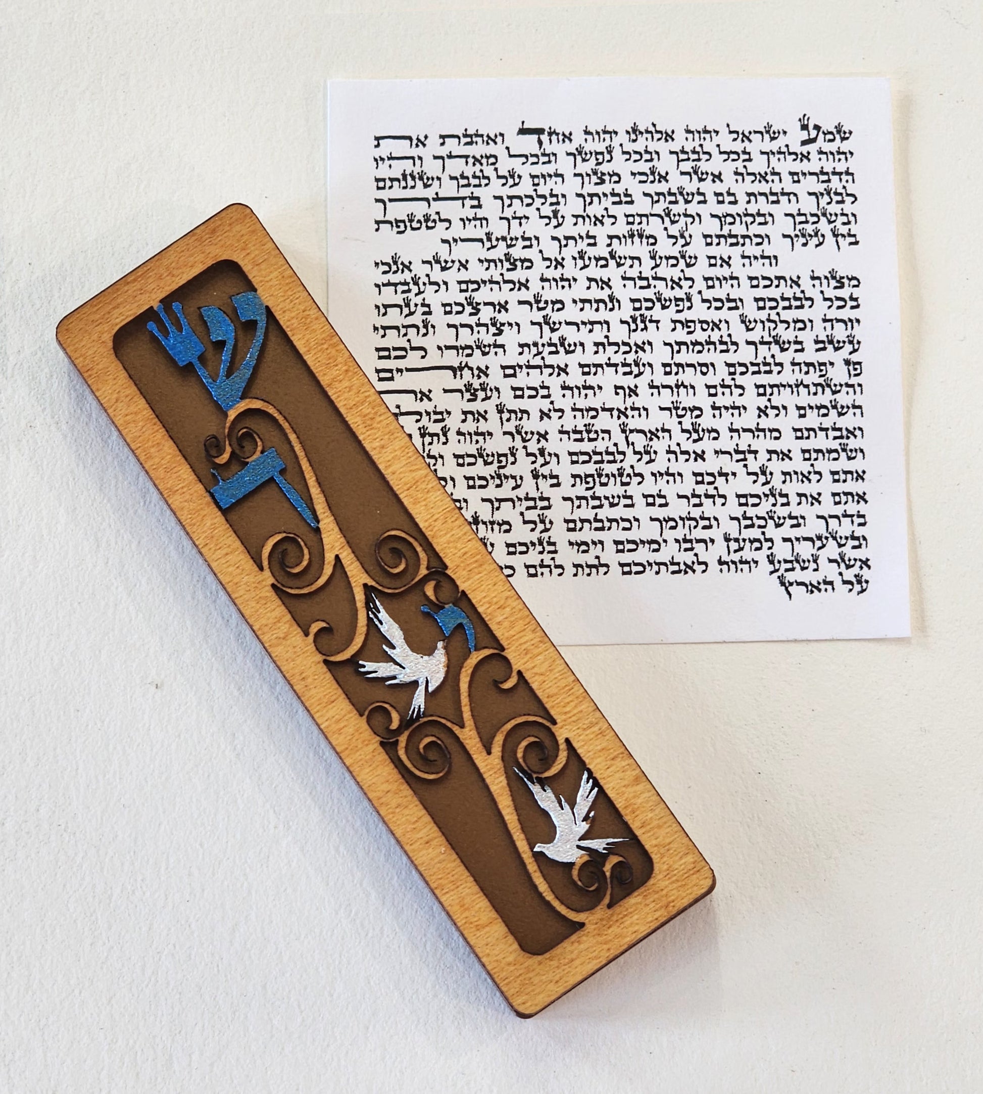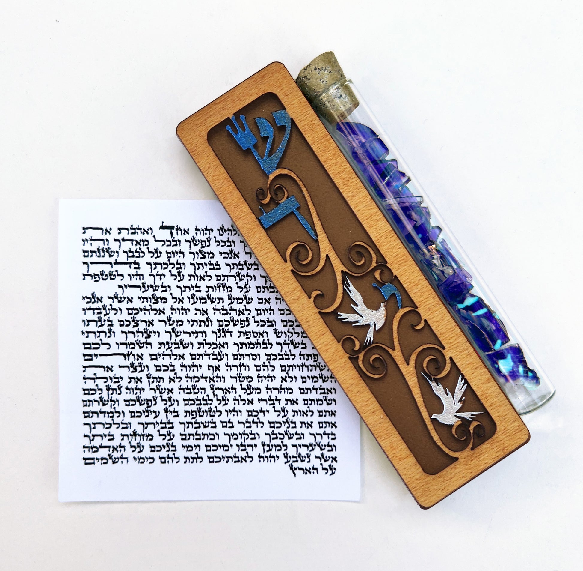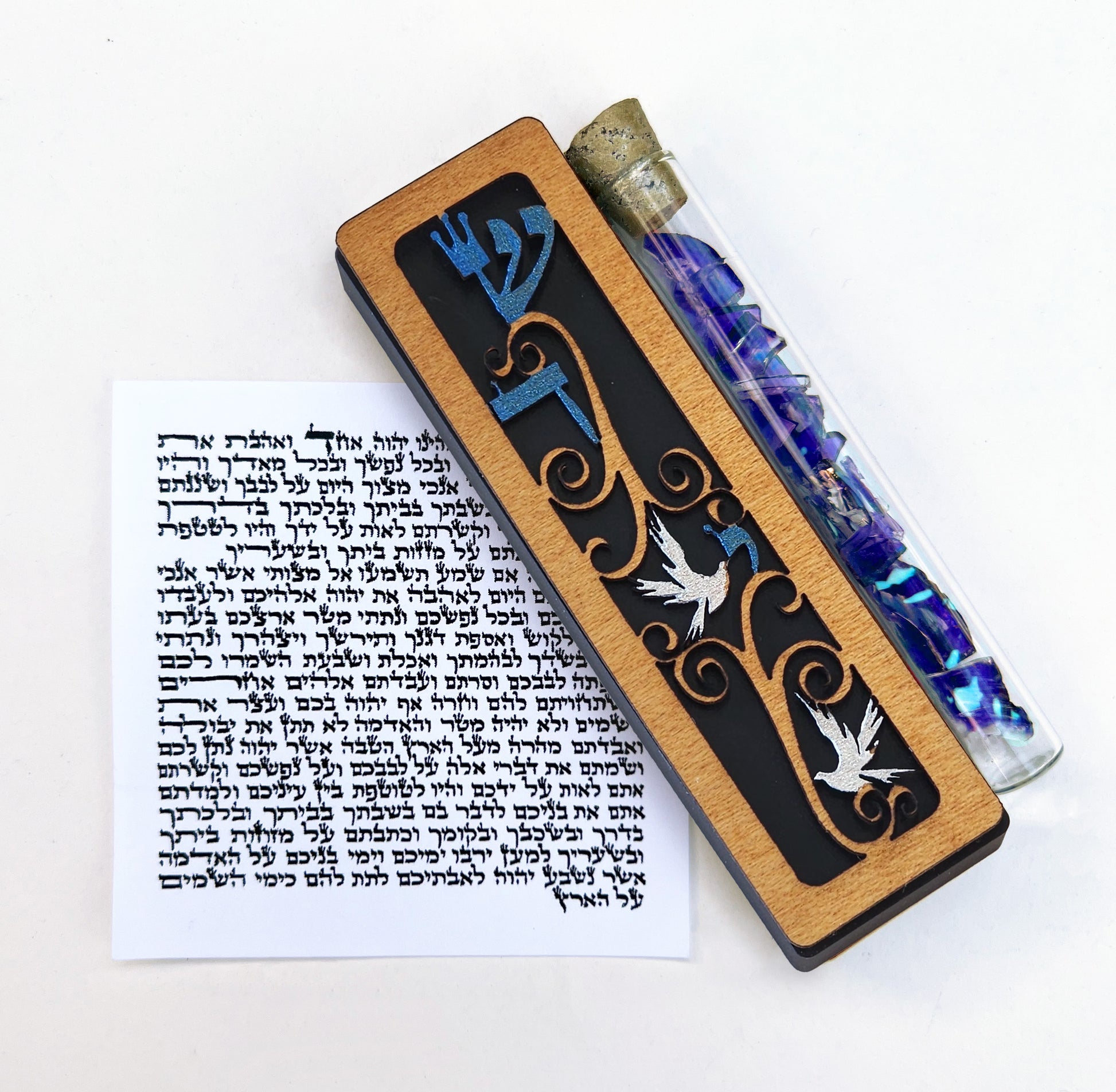 Gift boxed and ready for giving, this “Shaddai Doves” Mezuzah available with non-kosher scroll or with a kosher scroll*, is precision cut from mahogany wood, hand-painted, and based on a high-quality anodized aluminum case with self-adhesive backing. Also available with a glass tube firmly attached to the side for a newly wedded couple to fill with shards from their wedding glass.